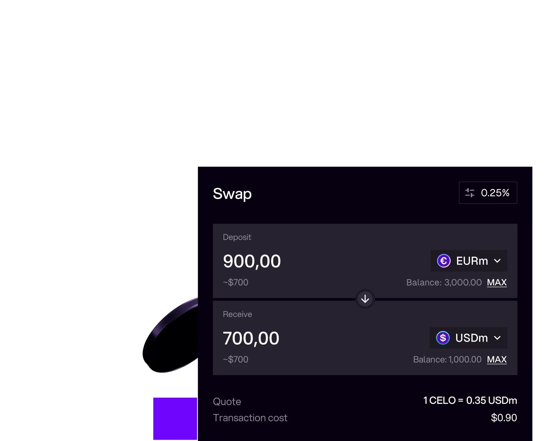Mento supports a growing set of stablecoins, including USDm, EURm, BRLm, KESm, COPm, PUSO, eXOF, and GHSm with more coming soon.